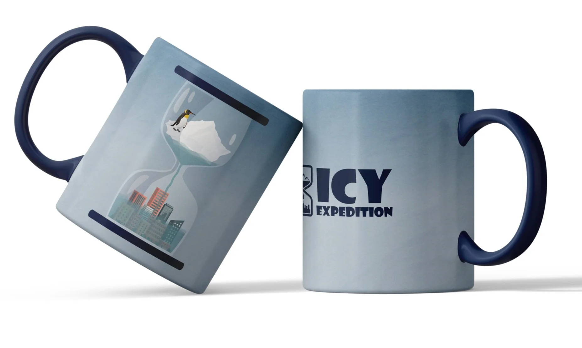 The logo portrays an hourglass with Antarctica in the top portion, a city skyline in the lower portion, and a falling drop of water. This symbolizes rapid ice loss and rising sea levels, reinforcing the urgent need to save Antarctica.
