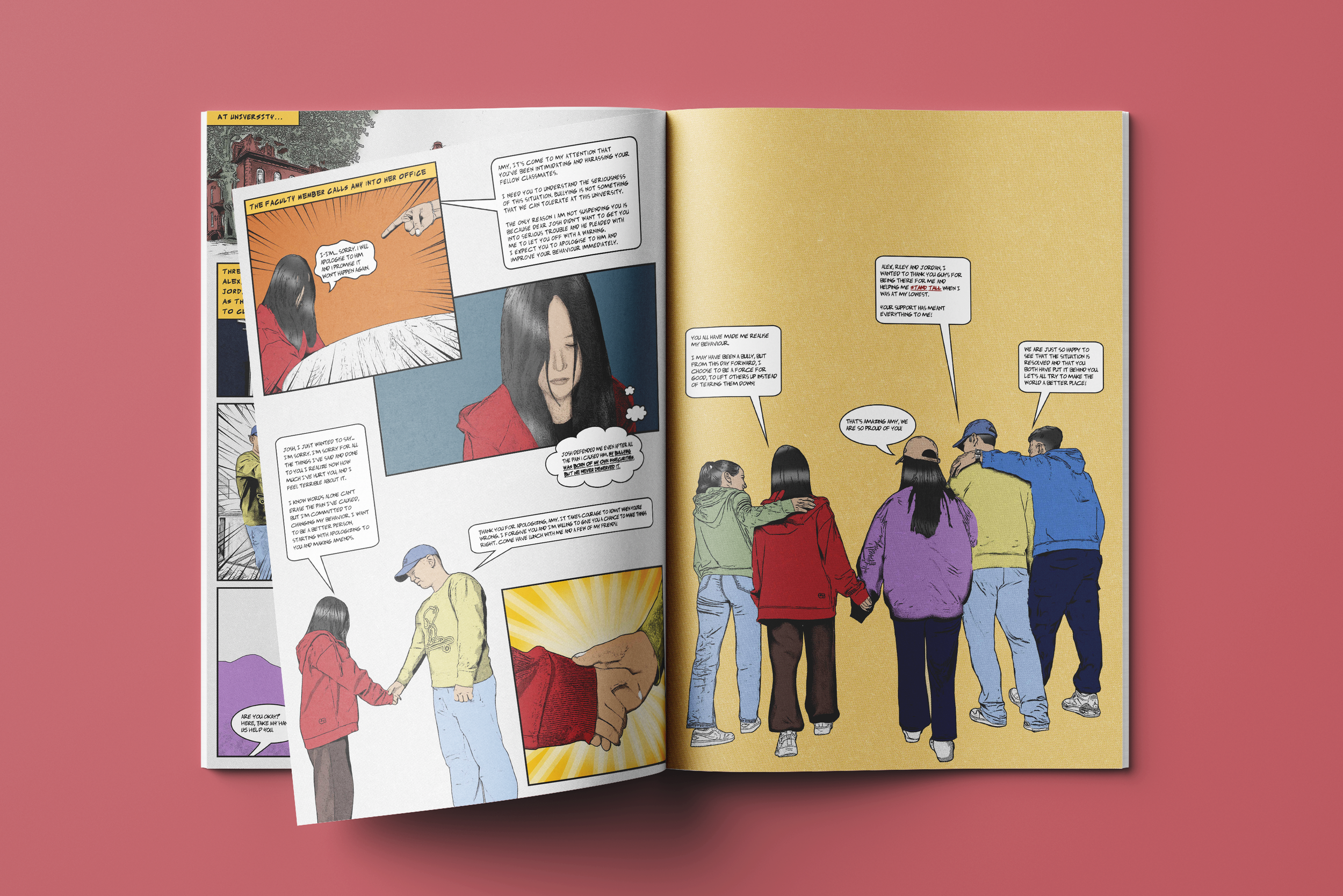 Standing Tall is a comic book which highlights the power of intervention, support, and seeking help from trusted authorities to address bullying on a university campus.